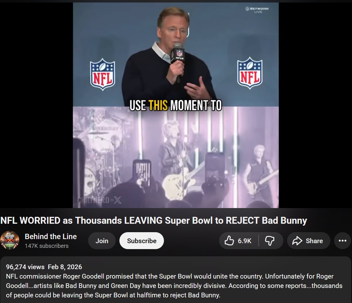 Roger Goodell has managed to alienate half the country (at least) with his woke version of what American NFL football should be about. OK Roger you may get more viewers in Colombia, Portugal, or maybe even Botswana but you will shed more in the States. Congratulations the numbers for TP-USA’s halftime show just proved you created a cottage industry in half time alternative programming. How will your advertisers like that? You think they will still pony up 8 million for a thirty second spot? I will leave it below to the folks to get into the specifics of why this was a bad decision long term.