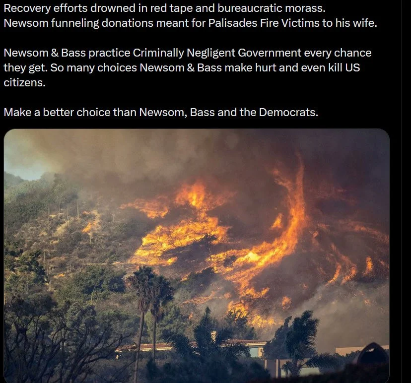 ….. as Mayor of LA concerning the fires in LA and throughout California, and also during the LA riots, were dereliction of duty and Criminally Negligent Governing. 29 people died because of it. Over a year later fire victims STILL can't get permits to rebuild their homes! Brush not cleared in violation of State Law. Fire Department under staffed, unprepared and ill equipped. Reservoirs unbuilt in violation of State Law. Existing Reservoirs empty, no water in the fire hydrants. A long record of the homeless starting wildfires ignored. LA mayor partying overseas. CA governor partying and wrestling young boys in China as California burned.