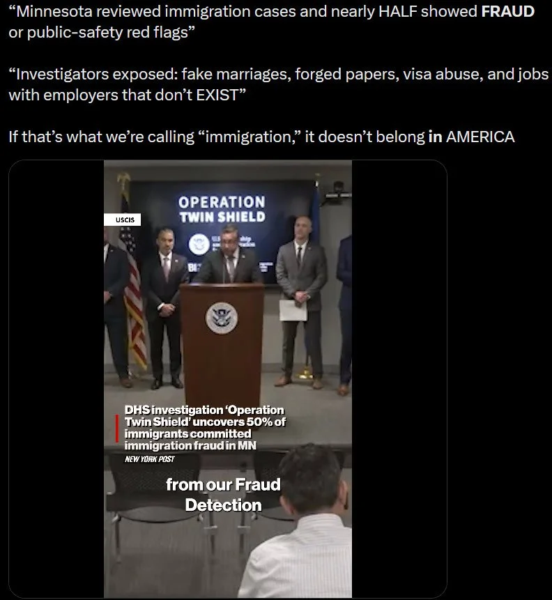 ) recirculated Edlow's press conference clips, often adding commentary like "nearly half of all Somali immigrants in Minnesota found to have committed immigration fraud" or listing types like marriage fraud, tax/loan fraud, money laundering (though official USCIS releases stuck to immigration-specific issues).