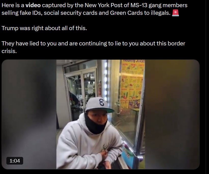 MS-13 gang members have been linked to selling fake IDs, green cards, Social Security cards, and other fraudulent identification documents to illegal immigrants (often referred to as "illegals" in conservative reporting), particularly in high-profile incidents in New York City.The most widely circulated and recent prominent case stems from a March 2024 New York Post investigation, which captured undercover video footage of alleged gang members—described as having ties to MS-13 and rival 18th Street gang—openly peddling these counterfeit documents on the streets of NYC, especially in migrant-heavy areas. Sellers reportedly offered: