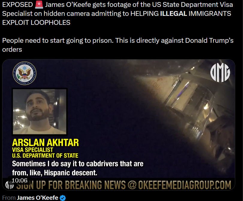 James O'Keefe's O'Keefe Media Group (OMG) released undercover footage in June 2025 exposing a U.S. State Department visa specialist, Arslan Akhtar, who was caught on hidden camera admitting to coaching illegal immigrants on how to exploit loopholes to evade deportation and stay in the country. The video went viral on X and conservative media, leading to Akhtar's immediate termination by the State Department.Key Details from the Sting Operation