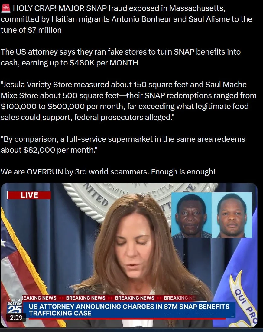 Yes, a major SNAP (Supplemental Nutrition Assistance Program) fraud case in Massachusetts involving Antonio Bonheur and Saul Alisme was announced by federal prosecutors in December 2025. The U.S. Attorney's Office for the District of Massachusetts charged the two men—both of Haitian origin—with large-scale SNAP benefits trafficking, totaling nearly $7 million in allegedly stolen or improperly redeemed funds. This has been highlighted in conservative media and on X as an example of welfare program abuse tied to immigrant communities, amid broader discussions of fraud in states like Massachusetts.Details of the Case
