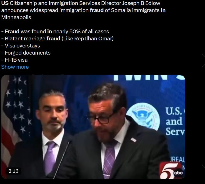 Joseph B. Edlow, as Director of U.S. Citizenship and Immigration Services (USCIS) under the Trump administration, announced findings from Operation Twin Shield in late September 2025, a large-scale immigration fraud investigation focused on the Minneapolis-St. Paul (Twin Cities) area in Minnesota. The operation targeted high-risk immigration cases, particularly in immigrant communities, and uncovered significant fraud in nearly half of the reviewed cases. While Edlow did not exclusively single out the Somali community in official USCIS statements, the probe centered on Minneapolis—home to one of the largest Somali-American populations in the U.S.—and viral clips/shared posts from the announcement have widely framed the results as exposing "widespread fraud among Somali immigrants" there.Key Details from Edlow's Announcement and Operation Twin Shield