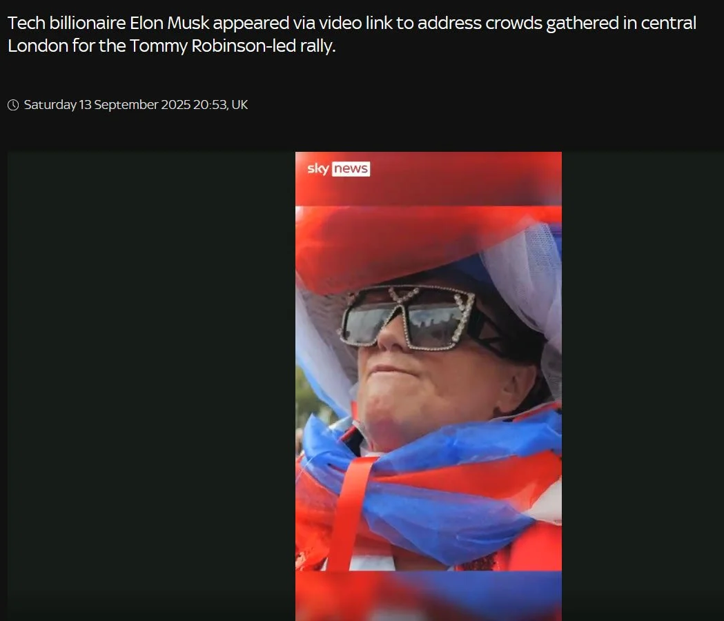 Key Themes and Demands: The rally focused on anti-immigration sentiment, with protesters carrying signs with slogans like "stop the boats" and "send them home."4 Speakers, including Robinson, as well as guests like Elon Musk (via video link) and French far-right politician Éric Zemmour, addressed the crowds, speaking about the perceived "erosion of Britain" and "great replacement" theories.5