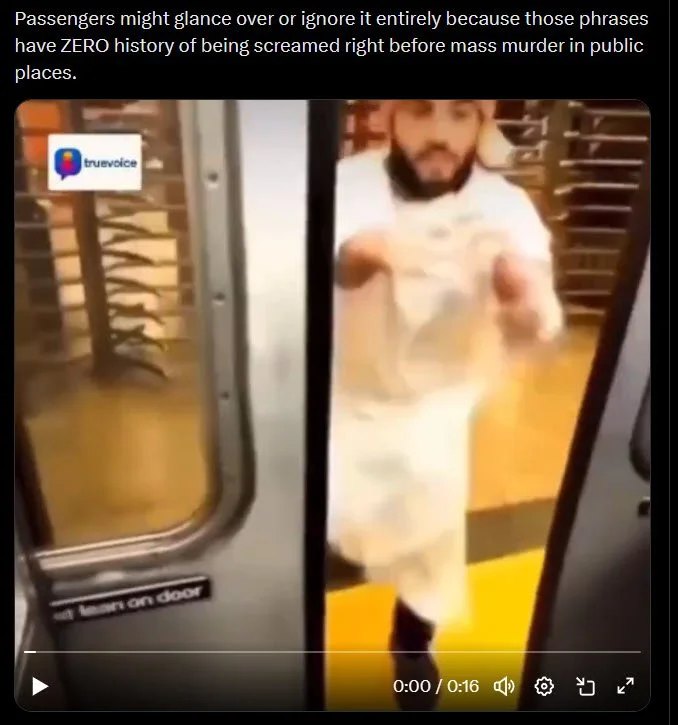 Instant terror. Passengers react immediately in fear leaping from seats rushing to doors and emptying the entire car in seconds. People sprint down the platform away from the train unsure if it is a threat or bomb. The man stands there as the car clears out fast showing how one phrase tied to Muslim attacks triggers real panic in public transport. No other group causes this level of instinctive fear with just words. Terrorism gets called religion-free but this moment proves otherwise when the shout links to past violence. The YouTube creator claimed the prank exposes stereotypes but does the exact opposite. Compare it to a Christian shouting “Praise the Lord!” or a Jewish person yelling “Baruch Hashem!” while holding a bag on the same train. Neither would empty the car. Passengers might glance over or ignore it entirely because those phrases have ZERO history of being screamed right before mass murder in public places.