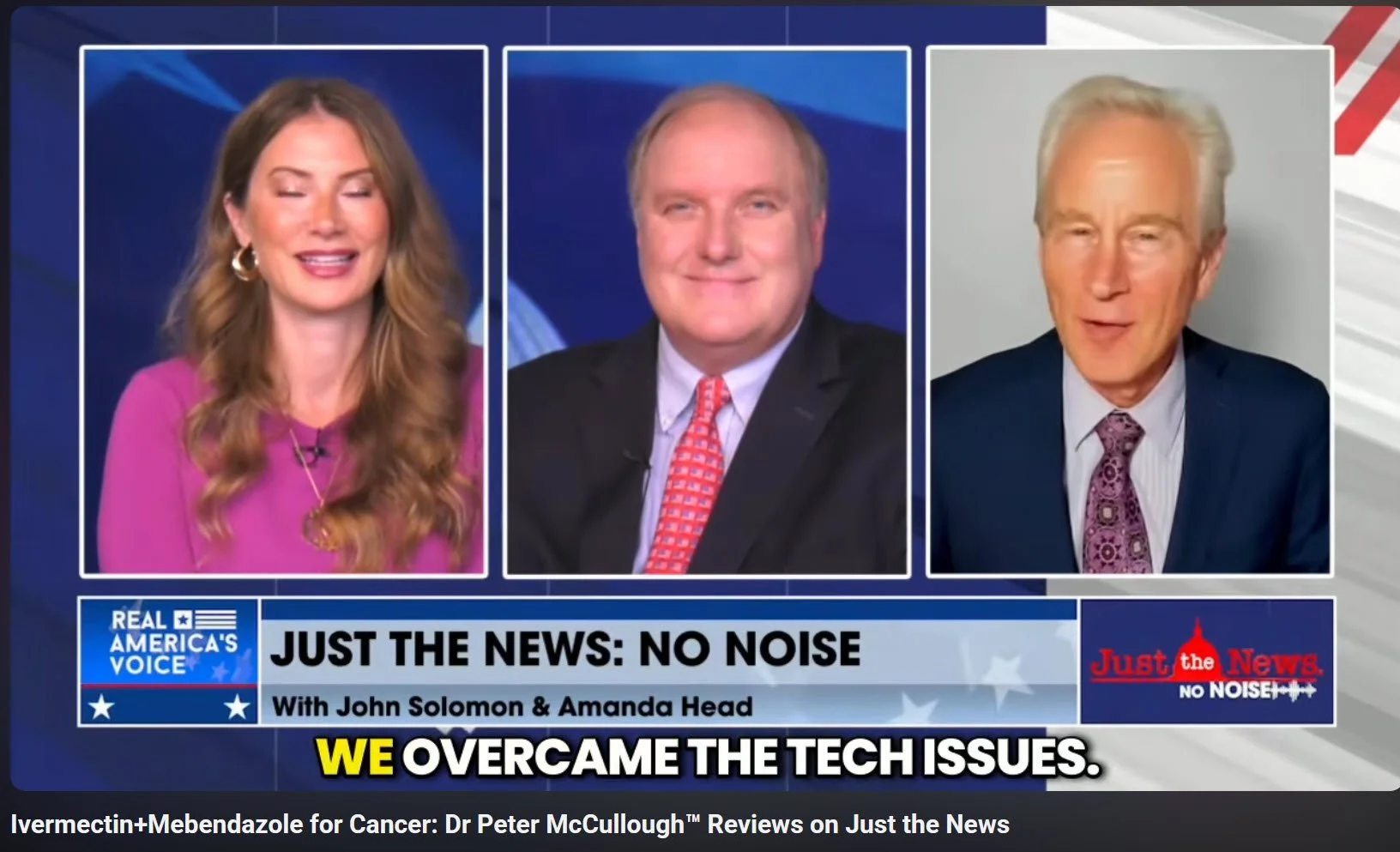 Real America's Voice Just the News with Amanda Head and John Solomon asked internist Dr. Peter McCullough™ about the growing off-label use of ivermectin and mebendazole. McCullough said the National Cancer Institute should conduct large prospective, double-blind, placebo-controlled randomized trials in a wide array of cancers. Courtesy Real America's Voice May 5, 2025.