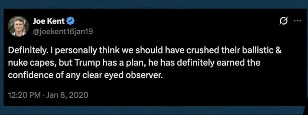 The left hated Joe Kent calling him a white supremacist and Nazi sympathizer. Now he has let them embrace him as a savior truth teller calling out Trump. Terrible decision for whatever reason on Kent’s part. If you take a principle stand, resign with honor and keep your mouth shut. Don’t do something that will embolden the enemy.