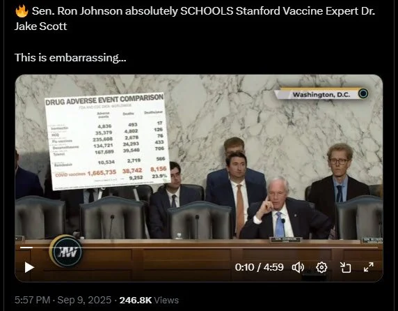 Senator Ron Johnson throws down the gauntlet to Stanford vaccine expert Jake Scott who has also highlighted that the vast majority of vaccine trials report safety data, and that vaccines are "the most thoroughly vetted of all medicines." Senator Johnson disagreed and said PROVE ME WRONG. It did not go well for Dr. Scott