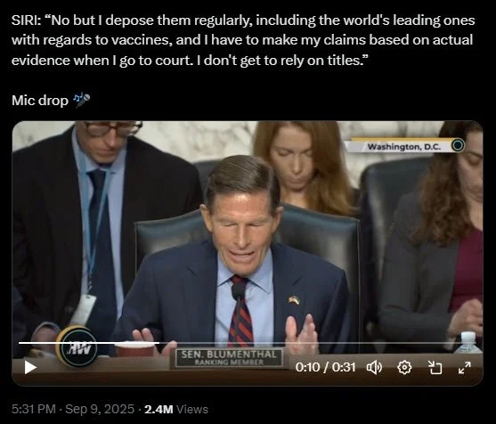 Aron Siri says Senator Blumenthal PROVE ME WRONG.. and the senator gets embarrassed… demonstrating again why slander and name calling is their recourse.