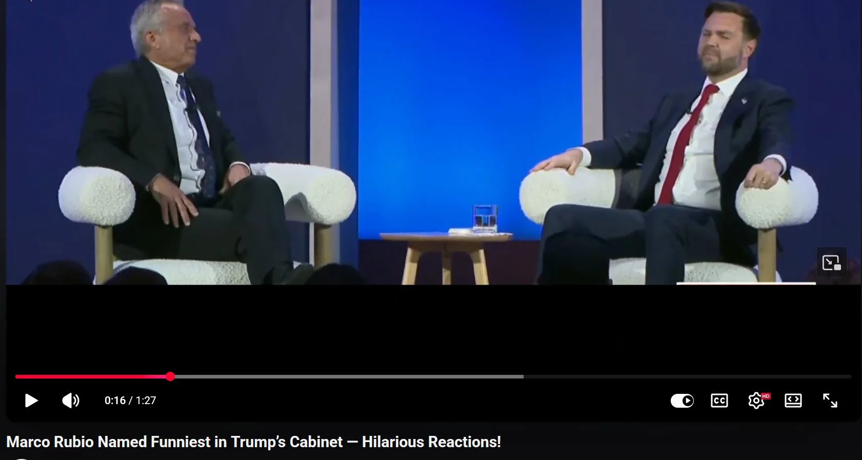 This endorsement gained traction in late 2025 during interviews and events (including around the MAHA Summit), where both praised Rubio's wit in cabinet settings. Vance stated: "My personal vote for funniest person outside the president is probably Marco. He has an incredible sense of humor. He's got great comedic timing." RFK Jr. fully agreed, calling Rubio "the funniest guy in the cabinet" and noting that he "says things that make people belly laugh every Cabinet meeting."