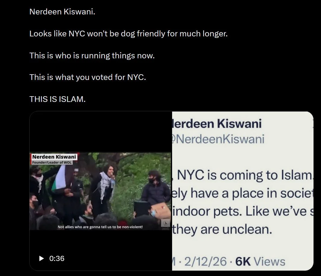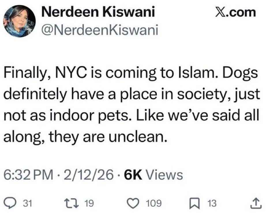 The Comment: After a winter storm left uncleaned dog waste on NYC sidewalks, Kiswani posted on social media that the "dog poop apocalypse" was proof the city should "turn to Islam," stating dogs are "unclean" and should not be indoor pets.