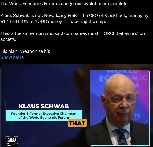 Larry Fink Warns Resistance to WEF-BlackRock Means 'Certain Death' BlackRock's Larry Fink wasted no time. His first message as the new head of the World Economic Forum were chilling: those who resist the global agenda will be eliminated. The Klaus Schwab years were just the rehearsal. Now the script has changed. The globalists believe too many have failed to comply - so they're shifting into what they call the "enforcement phase." And who better to lead it than the man behind BlackRock, the trillion-dollar titan that already shapes the world’s markets and governments? The union of BlackRock and the WEF isn't just strategy -it’s escalation. A warning shot to the world.
